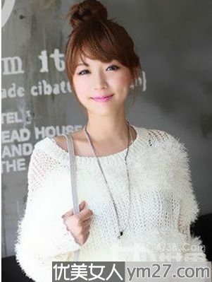弧形齐刘海丸子头,两侧凌乱发卷,随意散在脸颊两边,几乎包裹所有位置的设计,起到小脸的作用,而齐刘海增加可爱度又能扮嫩,年龄看起来年轻好几岁。