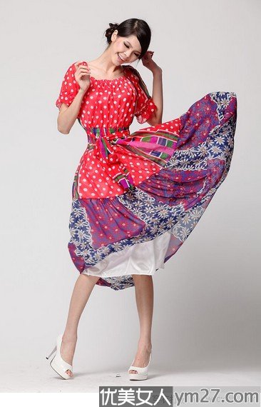 05 用极为艳丽的两种布料组合,圆点穿梭其中带来欢快的气息,腰部的格子图案又起巧妙的塑形作用,下摆的花朵明媚鲜艳,美得让人目不暇接。腰间设计有系带,束出纤纤细腰,与宽大的下摆组合尽展波西米亚风情。