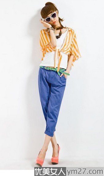 06 奶油色系的上装,高彩度的下装,是今夏流行的两大色彩关键。饱满明艳的蓝,和夏季风和日丽的天气完美吻合,穿出二十出头才有的激情与活力。深色系的裤装,修身显瘦。