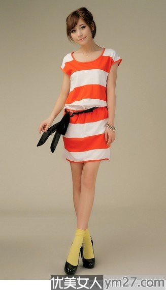 02 橙子的味道是清新的,甜而不腻。你喜欢把长发松松散散的挽起,自然恬静。宽松的条纹连衣裙没有浮华,没有雕饰。你温柔的抚弄着腰带,投来俏皮的眼神。活泼的色彩,干净的气质,确实与你相配。
