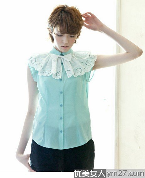 05 喜欢清新感觉的女孩子一定会钟情于蓝色,尤其是那种淡淡的蓝色,那种一眼看过去就觉得心无杂念,像是被净化了一般的纯净。恰是这种色彩的小飞袖衬衫牢牢的抓住了我的眼神,再加上纯白的镂空花领和漂亮的小领结,真是不得不爱啊。