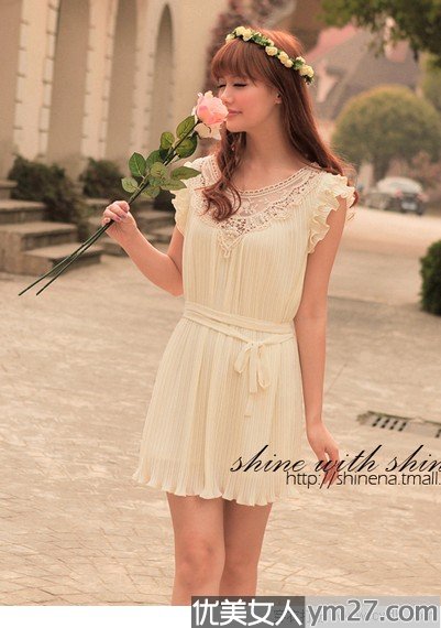 06 女孩子的心里都住着一个小天使,善良,安静。你拿着玫瑰走来,却比玫瑰更美。木耳边的双层袖子是天使翅膀的异化吧!百褶的雪纺裙下摆也像漂亮的花瓣,夕阳的金光渗透进长发,时间仿佛停止了,你真的是天使吧!
